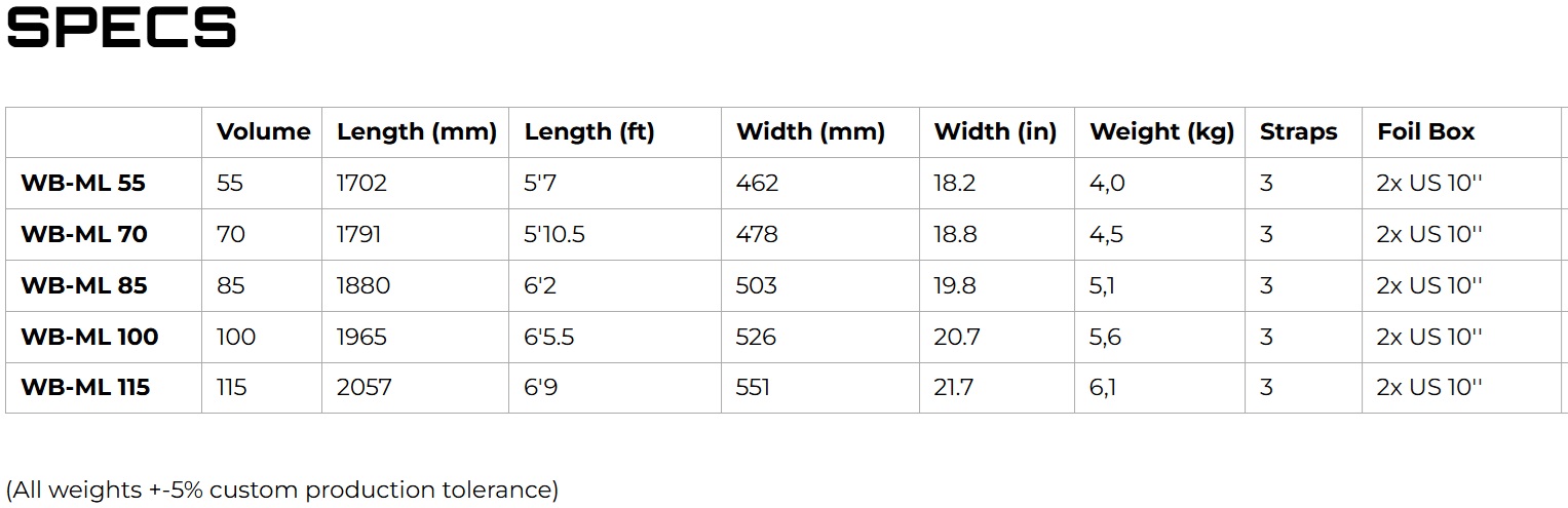 The WB-ML 55 is perfect for lightweight riders or those looking for high-performance in extreme conditions. Ideal for light wind winging, prone foiling, and aggressive para winging, the 55L offers unparalleled agility and control. This board excels in high wind conditions and delivers a sharp, responsive ride even matching some basic freestyle moves. The narrower outline makes it highly maneuverable while still offering enough stability for quick takeoffs. With a sleek, compact design, this board also performs incredibly well for prone foiling. Whether you’re chasing a high-wind parawing session or pushing into prone foil, the WB-X 55 provides just the right amount of balance without compromising performance.