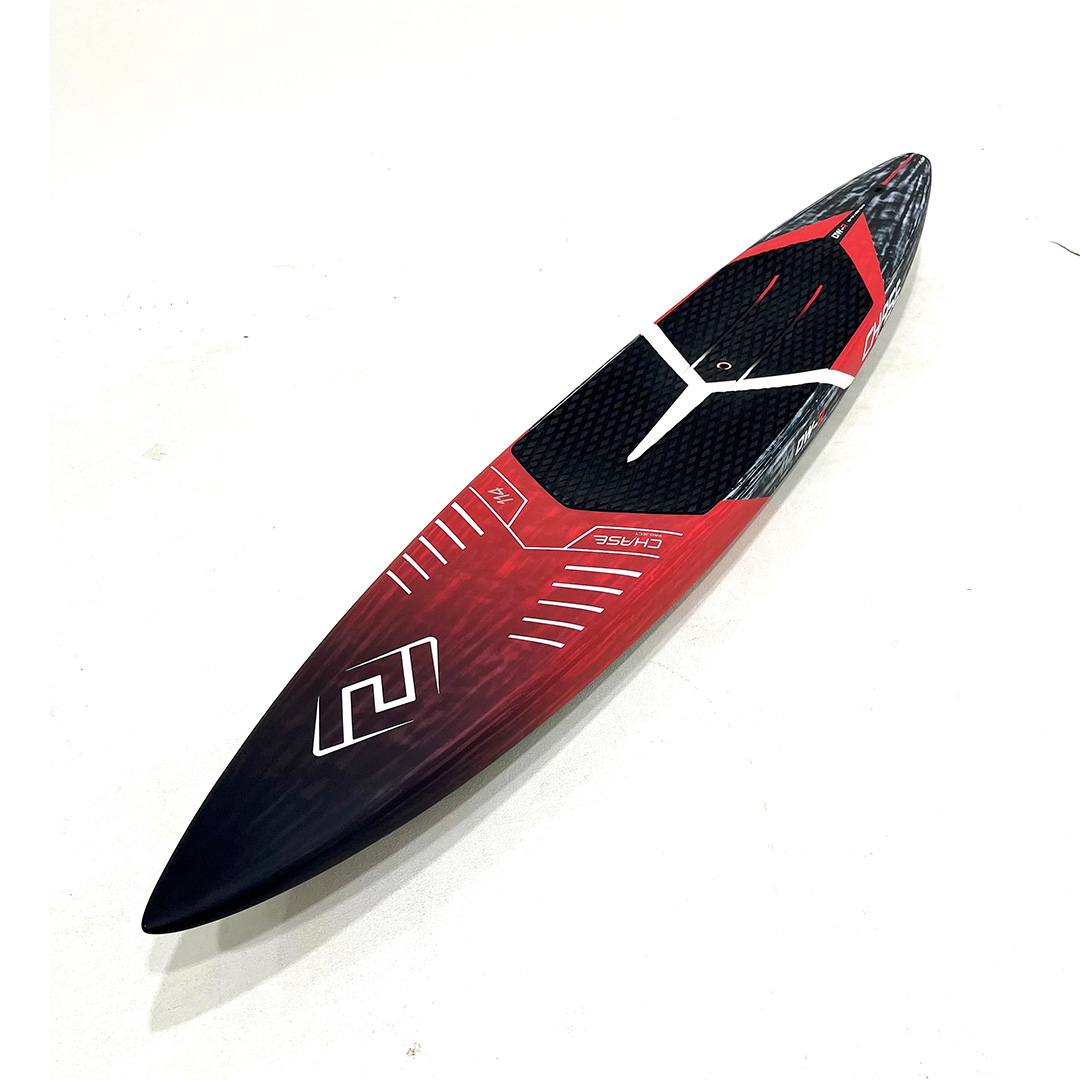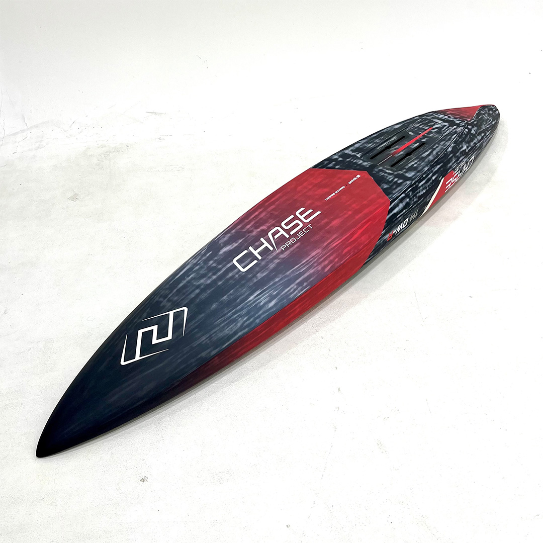 SMART WIDTH The width has been optimized for downwind racing starts, from seated to standing, offering a perfect balance of stability and flat water performance. While narrower boards excel at speed, this design strikes the sweet spot: narrow enough to perform well in flat water, but wide enough to ensure stability in the chop and swell of ocean racing conditions. This width allows for smoother downwind transitions and reduces the likelihood of instability during more turbulent conditions.