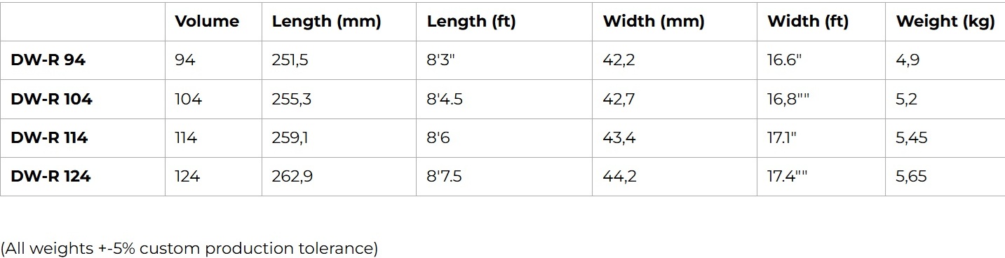 After extensive prototyping and testing in a wide range of conditions, the DWR range is ready to elevate your downwind SUP foiling. Whether you're charging open-ocean runners, training in light wind, or competing in long-distance DW races, the full Carbon PVC construction is here to maximize your efficiency in every aspect of the ride. The refined DW rocker profile, specific to each volume, and carefully tuned volume distribution make them the ultimate tool for riders seeking for something new, fresh and precise. We recommend to use around 25 to 30 liters above your body weight, in order to unleash the full potential of these weapons.