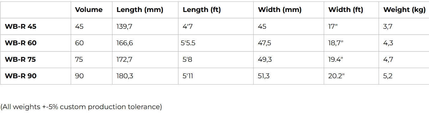 The 60L, 75L, and 90L sizes are designed with a higher aspect shape, but still slightly shorter and narrower than traditional mid-length boards, offering more agility when pumping, tacking, jibing while still ensuring maximum stability during the most demanding wingfoil races.