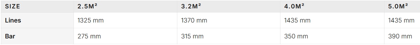 The bar length is scaled to the canvas size and kept compact to make stowing on foil and packing down easier, even on larger sizes.